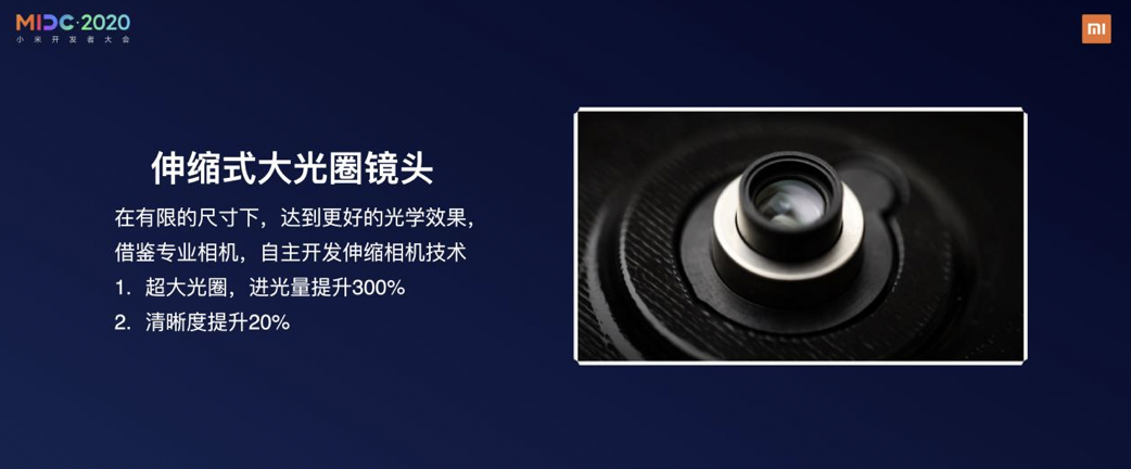 速途網11月5日(報道:喬志斌)今日,小米舉辦MIDC2020開發者大會,會上,小米集團副總裁、手機部總裁曾學忠也帶來了小米手機在相機功能上的最新預研成果。近些年,相機畫質一直是手機廠商關注的重要性能之一。從傳統相機設計中汲取靈感,小米帶來了最新自主開發,伸縮式大光圈鏡頭技術。?結構方面,采用直立式可伸縮光學設計,通過伸縮結構輕松收納于手機之中,即用即開,伸縮之間瞭望遠方。