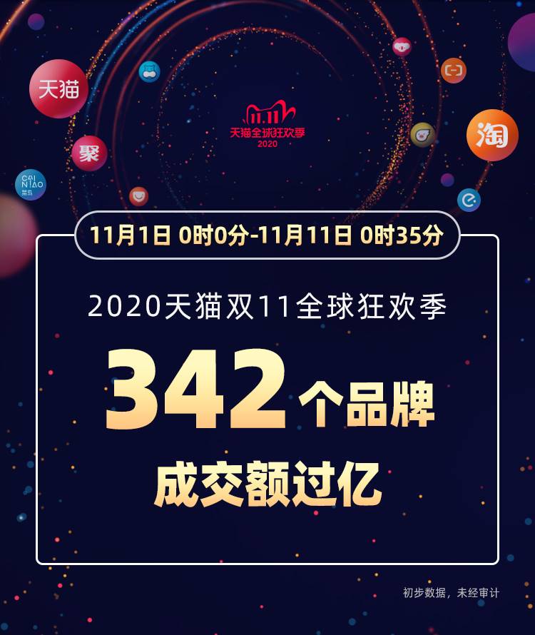 速途網(wǎng)11月11日消息(報(bào)道:李楠)從11月1日到11日0點(diǎn)35分,天貓雙11全球狂歡季已有342個(gè)品牌成交額突破1億元人民幣。