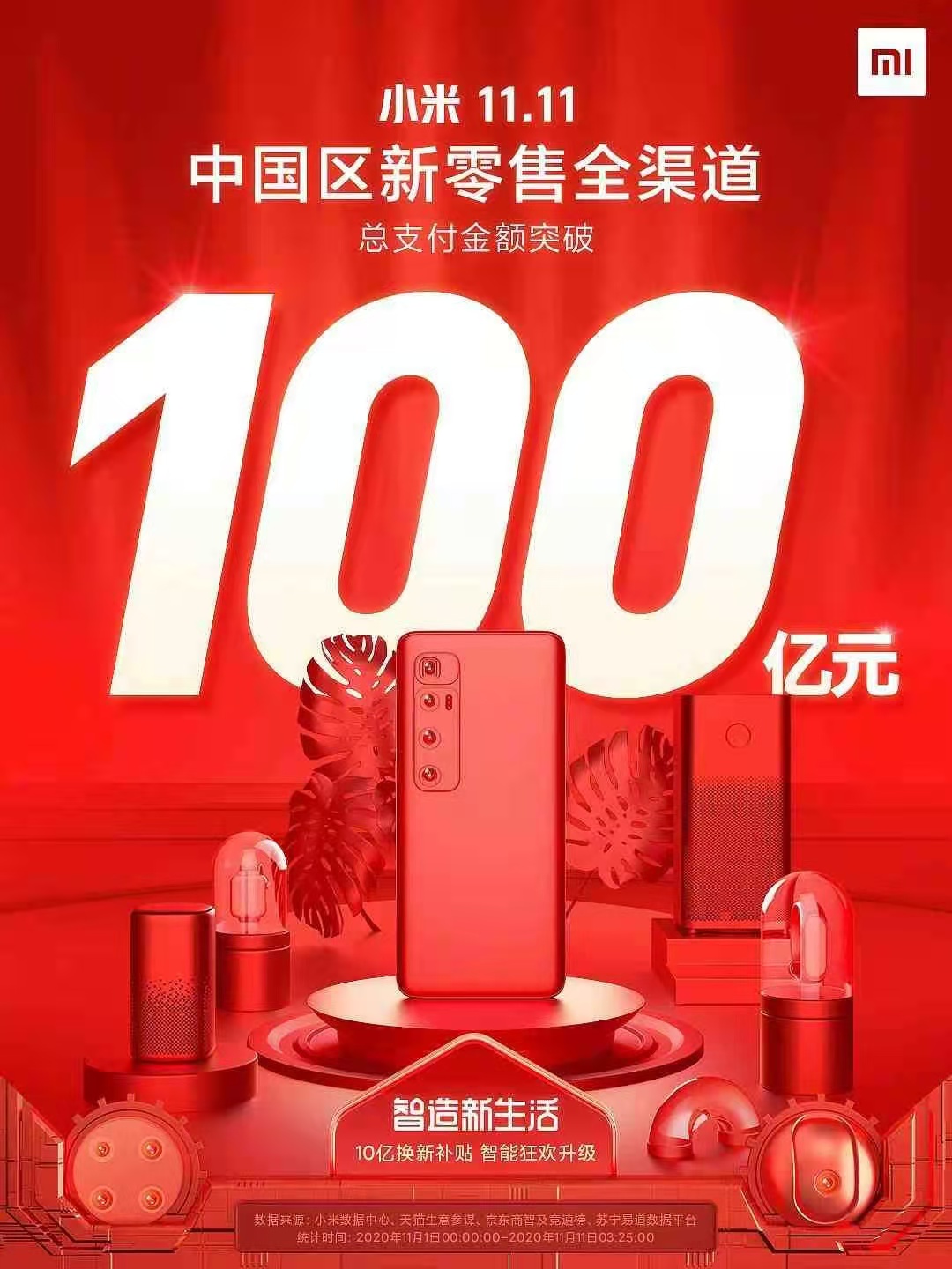 截止11月11日10:00,根據(jù)小米數(shù)據(jù)中心官方統(tǒng)計,小米中國區(qū)新零售全渠道總支付金額突破100億元,全面超越2019年小米雙十一銷售記錄。