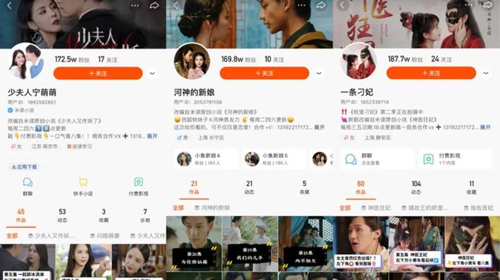 據了解,米讀制作的IP短劇在其運營的7個快手賬號下首播,包括@一條刁妃、@四叔和寶兒、@河神的新娘、@少夫人寧萌萌、@穿書少女、@一條嬌妻和@葉凡哥哥等頭部kol賬號,總粉絲量近千萬,全網總播放量高達12億,遠遠超出同體量的其他短劇,甚至相比于一些影視改編的長視頻內容,回報率更高。