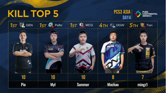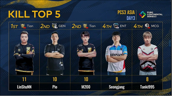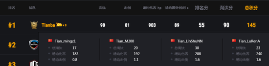 其中第三個比賽日的戰神榜上,Tianba戰隊的LinShuNN以11個淘汰獨占鰲頭,隊友M200也不負眾望與GEN戰隊的Pio并列第二,MCG戰隊的Tanki995以8個淘汰排名第四。
