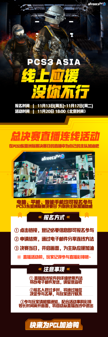 本次PCS3東亞洲際賽決賽推出線上應援活動,即日起至17號參與報名,可在PCS3東亞洲際賽決賽上為自己的主隊加油鼓勁。電腦、平板、手機均可參與,11月20日,PCS3東亞賽區決賽當日,為戰隊應援加油吧!