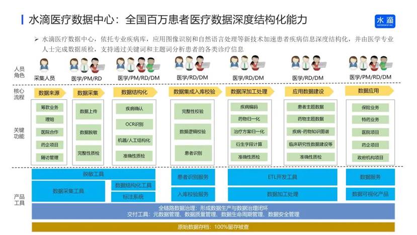 基于每年近百萬個求助項目的數據積累和沉淀,水滴研發團隊今年搭建了水滴醫療知識圖譜,并于今年7月份正式成立了水滴醫療數據中心,依托專業疾病庫,應用OCR和NLP等技術加速患者疾病信息深度結構化,并由醫學專業人士完成數據質檢,支持通過關鍵詞和主題詞分析患者的各類診療信息。同時持續優化數據結構化流程,以期高效、優質積累各領域的研究數據。以場景為舟,以科技為槳,以需求為舵,助力中國醫療健康大數據發展。