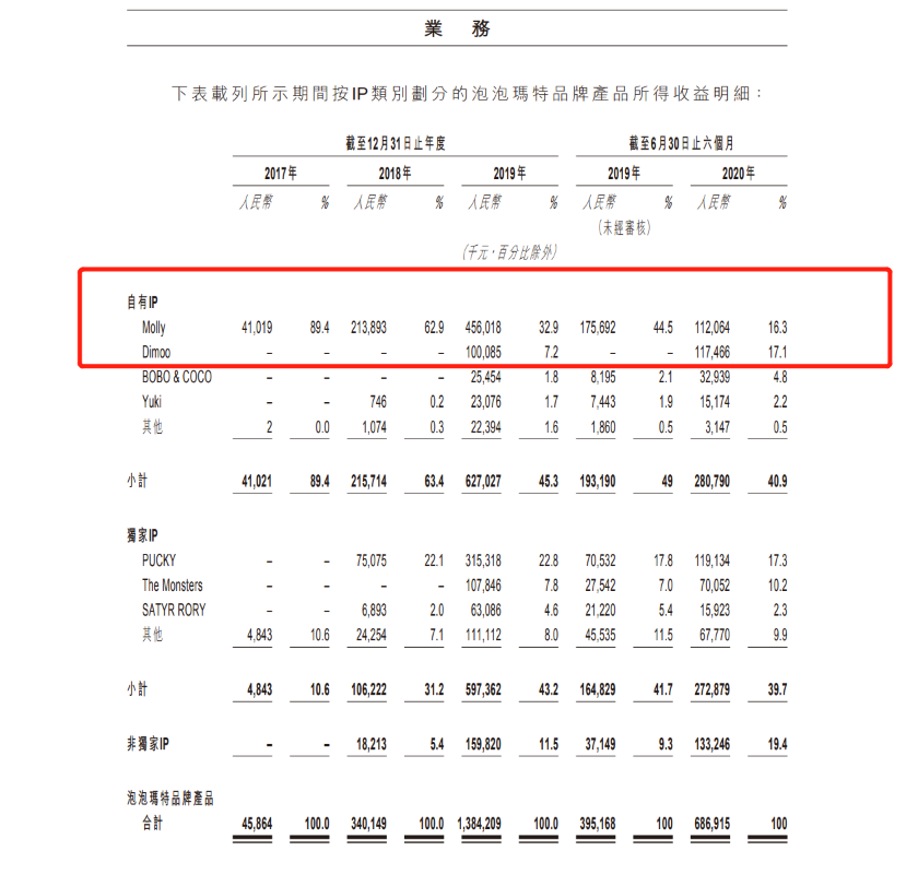 招股書中顯示,泡泡瑪特自有IP品牌所得收益占比逐年走低,但依然是泡泡瑪特的主要營收部分,尤其是依賴招牌IP-Molly的跡象開始得到改善,截止今年6月底,自有IP-Dimoo、獨家IP-PUCKY分別憑借17.1%、17.3%的收益占比超過Molly。