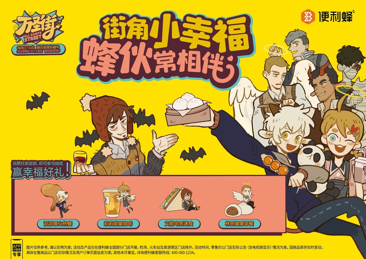 速途網11月30日訊(報道: 王璇)近日,便利蜂與國漫IP《萬圣街》達成合作。活動期間,便利蜂將整合包括店內口播、海報、電視屏視頻及線上APP、新媒體等在內的全渠道資源,與《萬圣街》IP展開內容聯動。