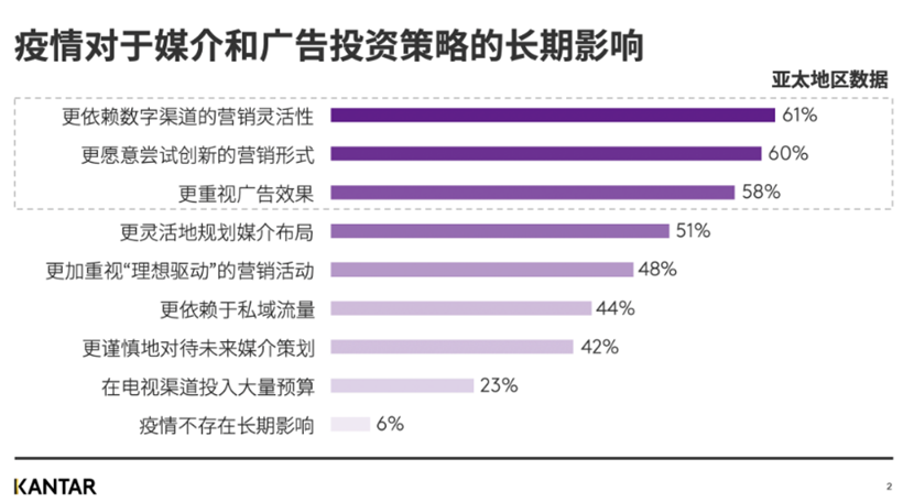 報告同時指出,由于在2020年全球遭遇新冠肺炎疫情,亞太地區接受調研的品牌主和營銷人員中,高達94%的人認為疫情對媒介與廣告投資的策略產生了“長期的改變”。