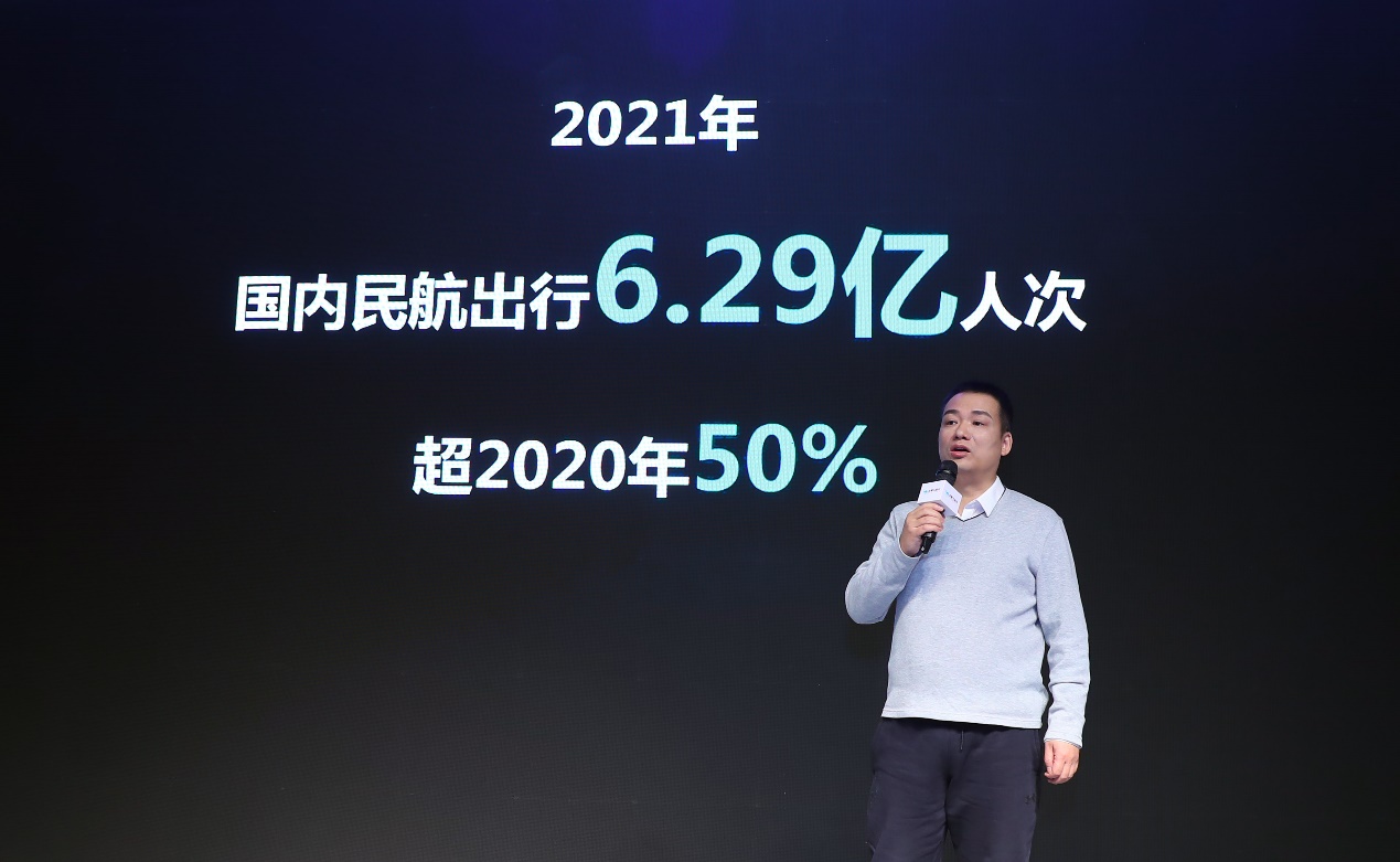 (圖說:在12月2日發布會上,去哪兒大數據研究院院長蘭翔發布2021年預測報告,國內民航出行將達到6.29億人次)