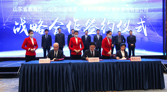 (山東省教育廳、山東出版集團、騰訊公司三方簽約合影)