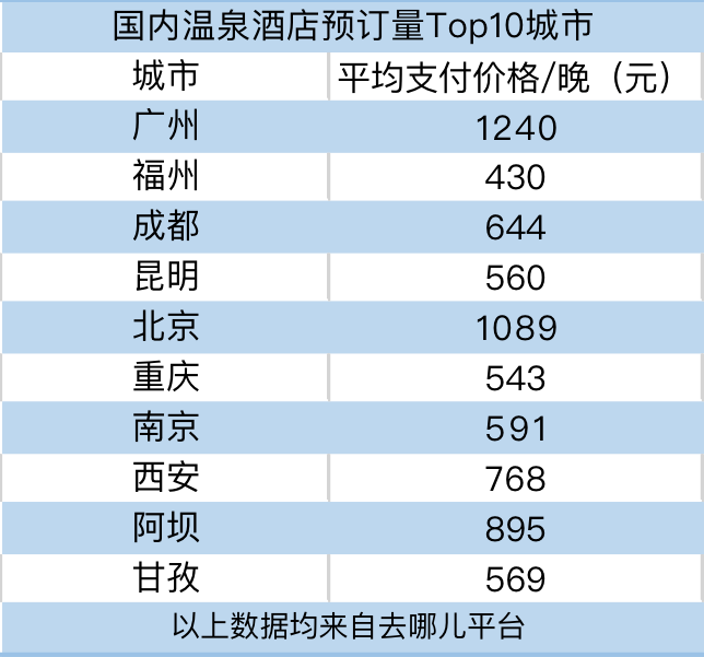 讓人意外的是,南方人更愛泡溫泉。去哪兒發布的國內溫泉酒店預訂Top10城市中,廣州位列第一,北京和西安成為“唯二”入圍的北方城市。