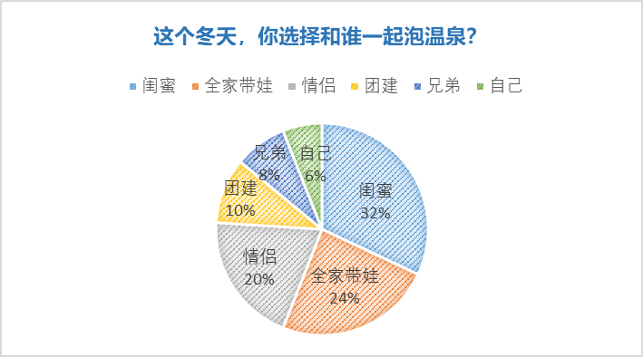 不同年齡段的人有不同的選擇,但閨蜜總是最好的選擇。去哪兒數據顯示,32%的消費者選擇和閨蜜一起泡溫泉,全家帶娃占比達到24%,情侶占比為20%;兄弟一同“泡湯”和“我溫暖我自己”共14%;年底,職場打工人的團建也提上日程,占比為10%。