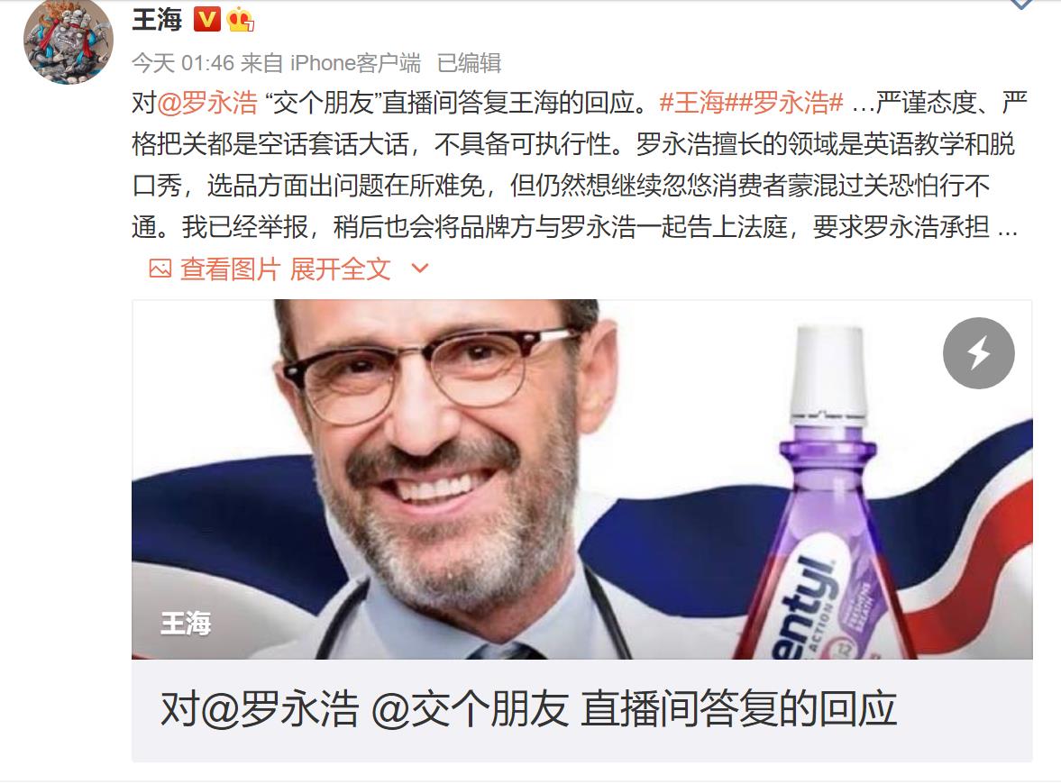 速途網12月15日訊(報道:王璇)今日凌晨, 打假人王海發文再度回應羅永浩“帶貨漱口水涉嫌虛假宣傳”一事。王海在長文中一一回應了此前羅永浩和交個朋友公司針對王海質疑的回應聲明,并強調羅永浩方面這份聲明并不成立,羅永浩依然要對產品涉嫌虛假宣傳負責。