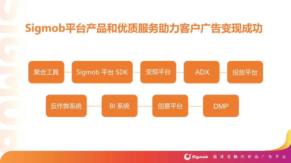 Sigmob能獲此榮譽(yù)離不開(kāi)長(zhǎng)久以來(lái)平臺(tái)全面完善的基礎(chǔ)建設(shè)。如何在全球放緩的大環(huán)境中深扎行業(yè),Sigmob堅(jiān)持以產(chǎn)品技術(shù)為核心,通過(guò)大數(shù)據(jù)和智能算法為開(kāi)發(fā)者和廣告主提供優(yōu)質(zhì)服務(wù)。平臺(tái)專(zhuān)注于創(chuàng)新的廣告形式,目前支持激勵(lì)視頻、全屏視頻、開(kāi)屏、試玩等主流廣告形式。旗下產(chǎn)品包括DSP、SSP、Ad Exchange、DMP、Sigmob SDK、Ad Network、聚合工具等,為合作伙伴提供全方位的業(yè)務(wù)支撐。截止目前,已經(jīng)服務(wù)了行業(yè)3000+廣告主、5000+開(kāi)發(fā)者,月請(qǐng)求量達(dá)到150億+、月展示量達(dá)到10億+。