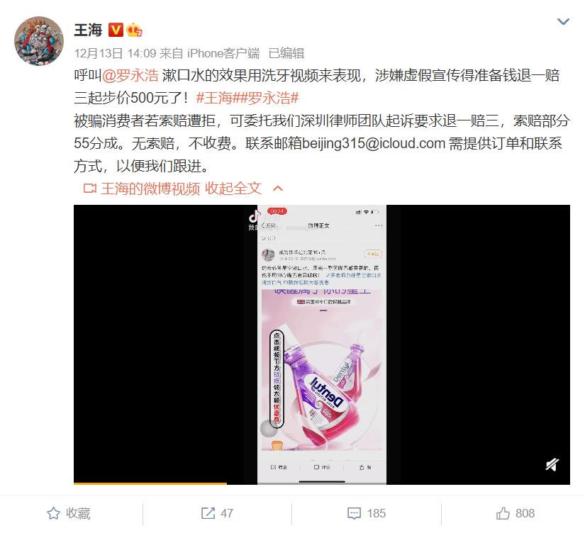 一切都要從打假人王海在微博上的討伐開始。本月13日,王海在微博指出,鄧特艾克星空漱口水,在宣傳視頻中將漱口水的效果用洗牙視頻來表現,涉嫌虛假宣傳。