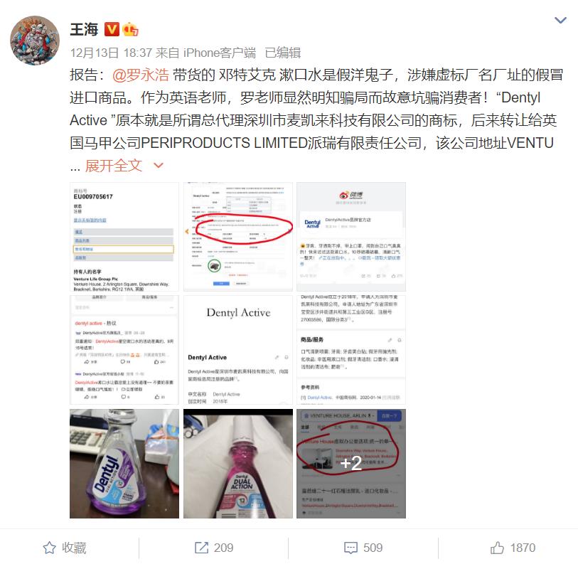 王海指出鄧特艾克漱口水雖然表面上稱為“英國進口”,但實為“假洋鬼子”。DentylActive中國商標本來是深圳麥凱萊科技發展有限公司的,為了成為派瑞公司的中國總代理,才將DentylActive中國商標轉讓給了派瑞公司,借用“品牌合法授權鏈路”的說辭,移花接木,誤導消費者以為產品是英國進口,實際則為“中國制造”。