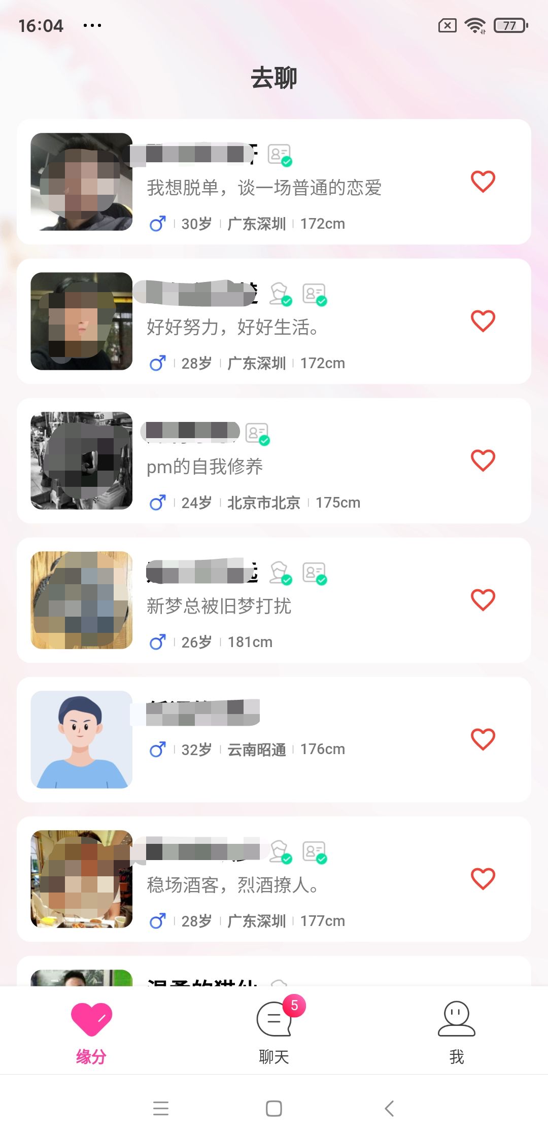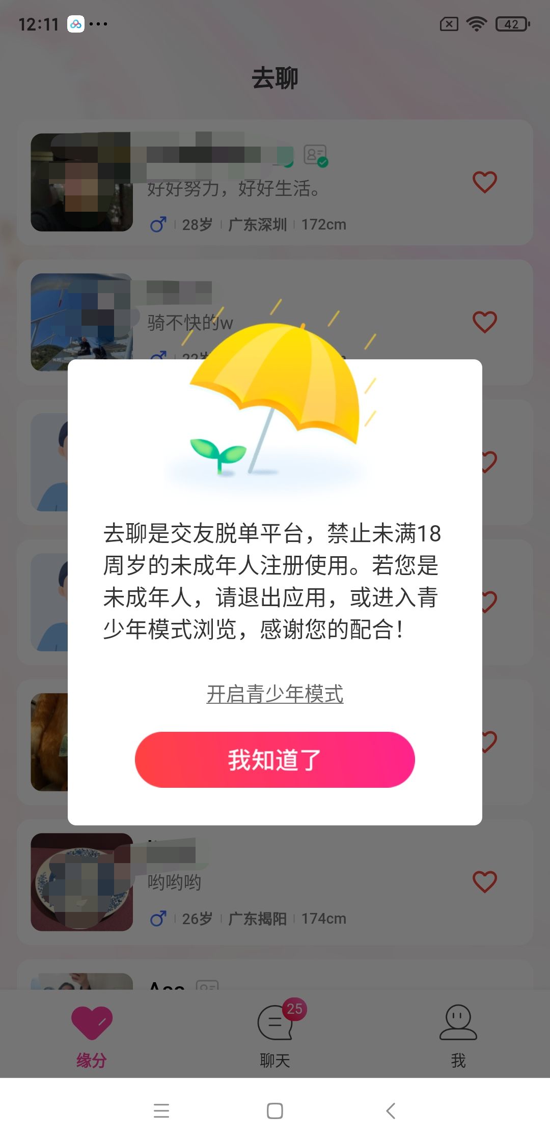 速途網了解到,“去聊”APP目前有“緣分”、“聊天”、“我”三個頻道頁,“緣分”頁是系統推送的異性用戶。