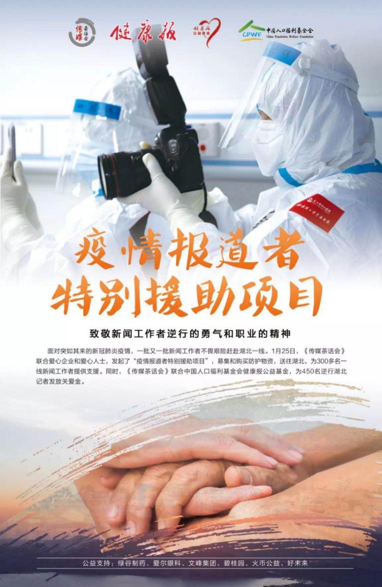 2020年1月25日(大年初一),《傳媒茶話會》、中國人口福利基金會健康報公益基金,聯合愛心企業、愛心人士等,發起了“疫情報道者特別援助項目”。該項目共籌集善款2764000元,前期用于為300多名一線記者購買防疫物資,后期剩余款項為450名“逆行”湖北的新聞工作者,按照每人每天100元的標準發放關愛金。