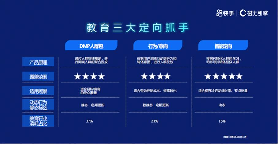 借助快手獨特的商業(yè)化基礎(chǔ)和強大的平臺數(shù)據(jù)分析能力,快手磁力引擎推出“DMP人群包+行為意向+智能定向”三大定向抓手,通過細(xì)化教育人群標(biāo)簽,精準(zhǔn)過濾目標(biāo)消費人群,以滿足不同教育品牌對用戶收割和效果轉(zhuǎn)化等方面的獲客需求。