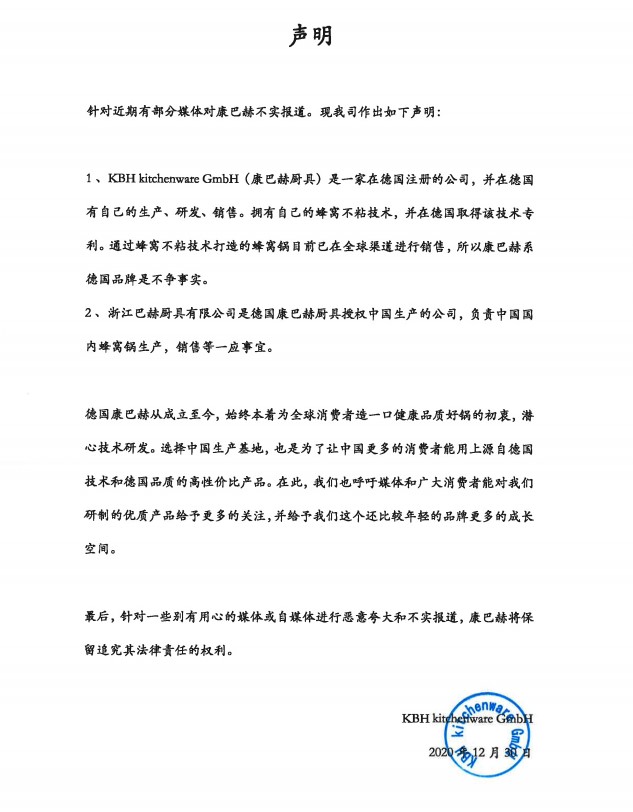 此外,聲明中還表示,浙江巴赫廚具有限公司是德國康巴赫廚具授權中國生產的公司,負責中國國內蜂窩鍋的生產、銷售等一應事宜。