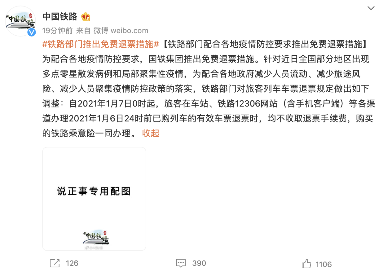 速途網(wǎng)1月6日訊(報道:喬志斌)今日,中國國家鐵路集團有限公司發(fā)布聲明。為配合各地疫情防控要求,國鐵集團推出免費退票措施。針對近日全國部分地區(qū)出現(xiàn)多點零星散發(fā)病例和局部聚集性疫情,為配合各地政府減少人員流動、減少旅途風(fēng)險、減少人員聚集疫情防控政策的落實,鐵路部門對旅客列車車票退票規(guī)定做出如下調(diào)整:自2021年1月7日0時起,旅客在車站、鐵路12306網(wǎng)站(含手機客戶端)等各渠道辦理2021年1月6日24時前已購列車的有效車票退票時,均不收取退票手續(xù)費,購買的鐵路乘意險一同辦理。