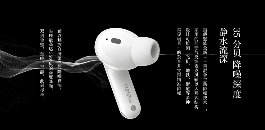 MEIZU POP Pro 搭載魅族全新「三重混合主動降噪技術」,采用的前饋與反饋麥克風以及 In-Ear 入耳式結構設計,可檢測「飛機、地鐵、街道等多種常見場景」的雜音, 輔以魅族第三代降噪算法,POP Pro 實現最高達 35dB 的深度降噪。