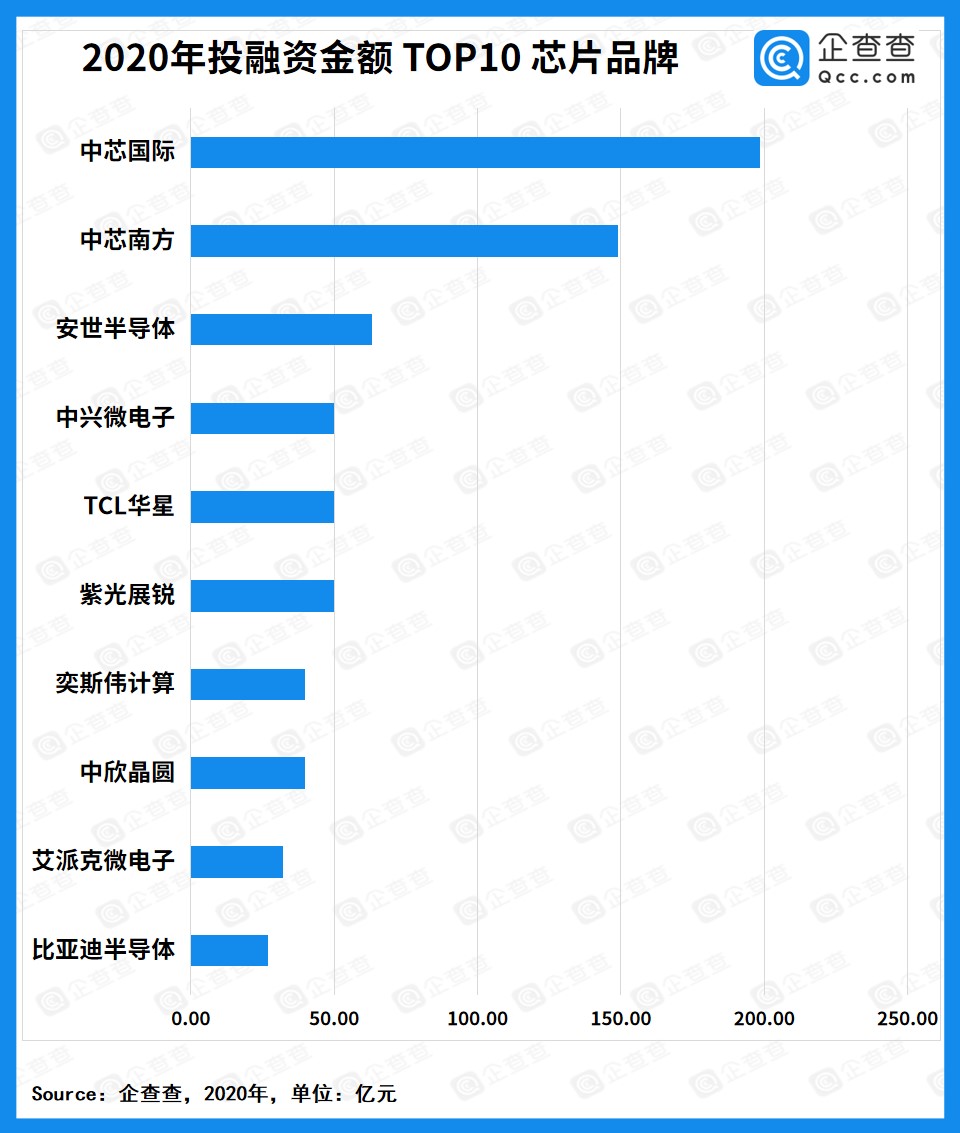 2020年,芯片半導體發生投融資事件458起,拿到融資的企業共計392家,總融資金額高達1097.69億元,最高融資金額被中芯國際拿下,合計198.5億元,由國家基金一期、國家大基金二期、上海集成電路和國家集成電路共同注資,皆為國資背景。據悉,中芯國際是世界領先的集成電路晶圓代工企業之一,也是中國內地規模最大的高科技集成電路晶圓代工企業。