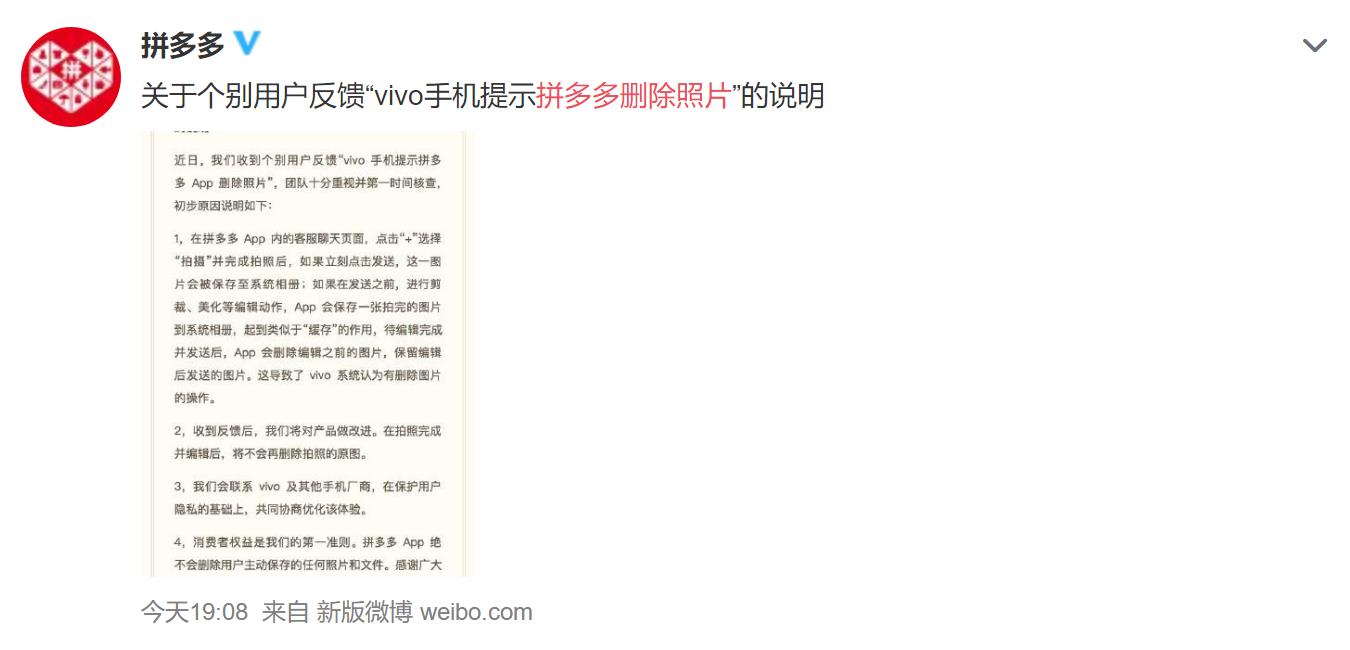 速途網(wǎng)1月12日訊(報(bào)道:王璇)今日晚間,拼多多通過(guò)官方微博發(fā)布關(guān)于個(gè)別用戶反饋“vivo手機(jī)提示拼多多刪除照片”的說(shuō)明。拼多多表示,收到反饋后將對(duì)產(chǎn)品做改進(jìn),在拍照完成并編輯后,將不會(huì)再刪除拍照的原圖。