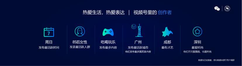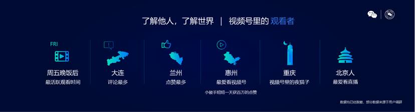 在微信公開課PRO現場,微信視頻號團隊也分享了一組視頻號趣味數據:用戶喜愛在周五晚上打開視頻號享受輕松的時刻,觀看最為活躍;周日則是創作者青睞的創作和分享時刻,發布內容在周日達到頂峰。廣東惠州用戶領先國內其他城市,成為“最愛看視頻號的城市”,惠州用戶小鼓手妞妞的一條視頻號內容更是一天獲贊百萬。具體到視頻數據維度,蘭州用戶最愛點贊,大連用戶最喜歡在評論區“嘮嗑”,北京用戶最愛看直播。85后女性則把視頻號當成“公開的朋友圈”,最愛在視頻號記錄生活的點滴。