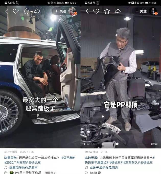 而資深汽車用戶或打算買車的人更聚焦汽車的性能、造型、價格。在這方面,年度車評人陳震同學、此地無垠、韓路聊車、閆闖說車、YYP顏宇鵬車言論等主播會通過快手進行實車體驗。比如陳震同學會點評汽車造型、車內(nèi)空間、配置內(nèi)飾,相當詳細和專業(yè),吸引了大批粉絲。此地無垠則更“硬核”,甚至會對汽車零部件進行拆解,讓觀眾一窺汽車工藝的奧秘。