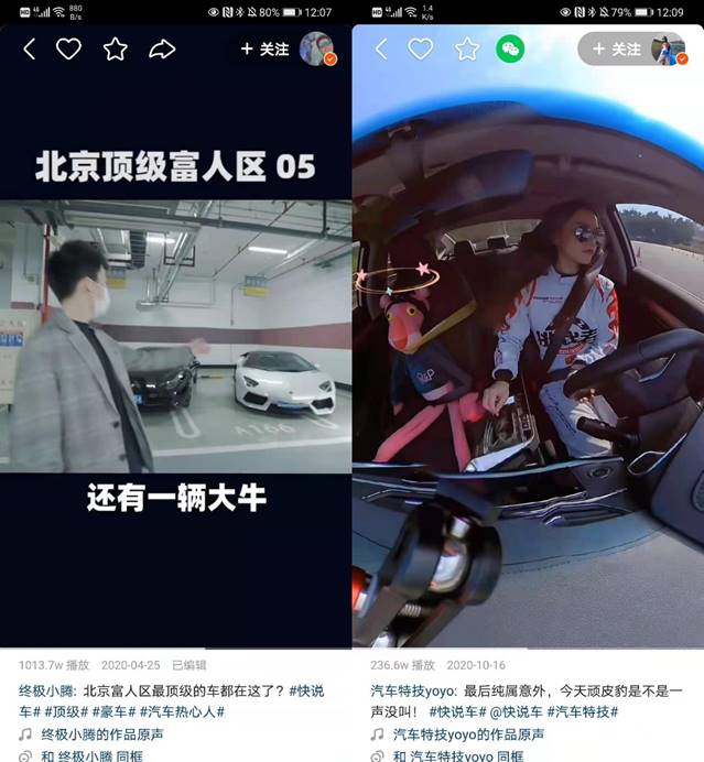 為了滿足汽車用戶對內(nèi)容的多樣化需求,快手也涌現(xiàn)了聚焦不同內(nèi)容方向的主播,比如高能創(chuàng)作者終極小騰、汽車特技yoyo、大可說車、老丈人說車、玩車報告。其中,終極小騰逛遍了國內(nèi)豪華酒店與富人區(qū)的地下停車庫,滿足了車迷們對于富人座駕的好奇心;汽車特技yoyo則有地表最強女司機之稱,跑出各種高難度汽車特技,讓觀眾大呼過癮。