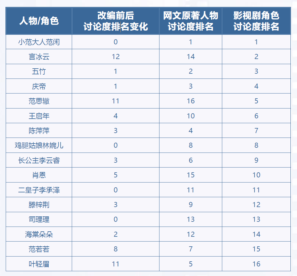 《慶余年》網(wǎng)絡(luò)文學(xué)、影視劇人物/角色討論度排名