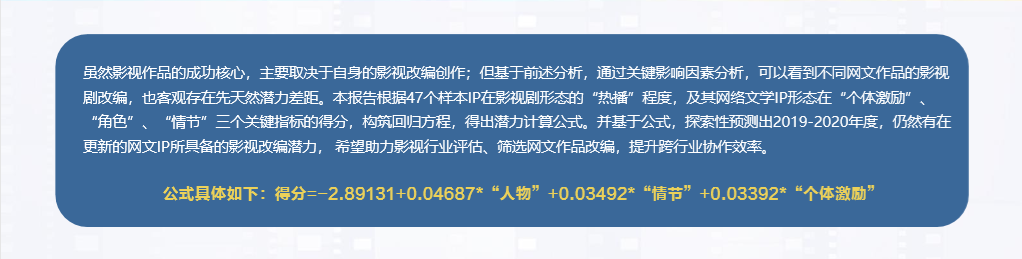 如何進(jìn)一步幫助影視行業(yè)發(fā)掘社會(huì)價(jià)值與藝術(shù)價(jià)值兼具的網(wǎng)絡(luò)文學(xué)IP,實(shí)現(xiàn)高質(zhì)高效的影視劇改編?根據(jù)2018-2019年度成功改編的網(wǎng)絡(luò)文學(xué)樣本IP,通過它們?cè)谟耙曅螒B(tài)里的“熱播”程度,以及網(wǎng)絡(luò)文學(xué)IP形態(tài)在“個(gè)體激勵(lì)”、“角色”、“情節(jié)”三個(gè)關(guān)鍵指標(biāo)的得分,《報(bào)告》嘗試構(gòu)筑回歸方程,對(duì)尚未影視上線的網(wǎng)絡(luò)文學(xué)IP改編潛力進(jìn)行科學(xué)量化評(píng)價(jià)。