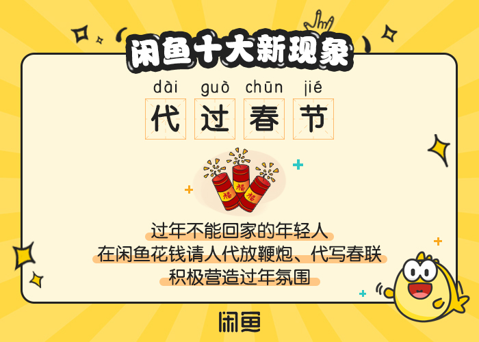 臨近春節(jié),打算宅家過年的人掀起健身消費(fèi)小高潮,但也有人在閑魚上花錢請(qǐng)人監(jiān)督,相伴瘦身。還有選擇就地過年的年輕人請(qǐng)人代放個(gè)鞭炮、代寫個(gè)春聯(lián)、代品品家鄉(xiāng)美食,這成為閑魚“代經(jīng)濟(jì)”發(fā)達(dá)的又一例證。