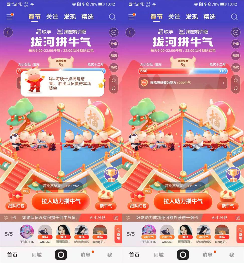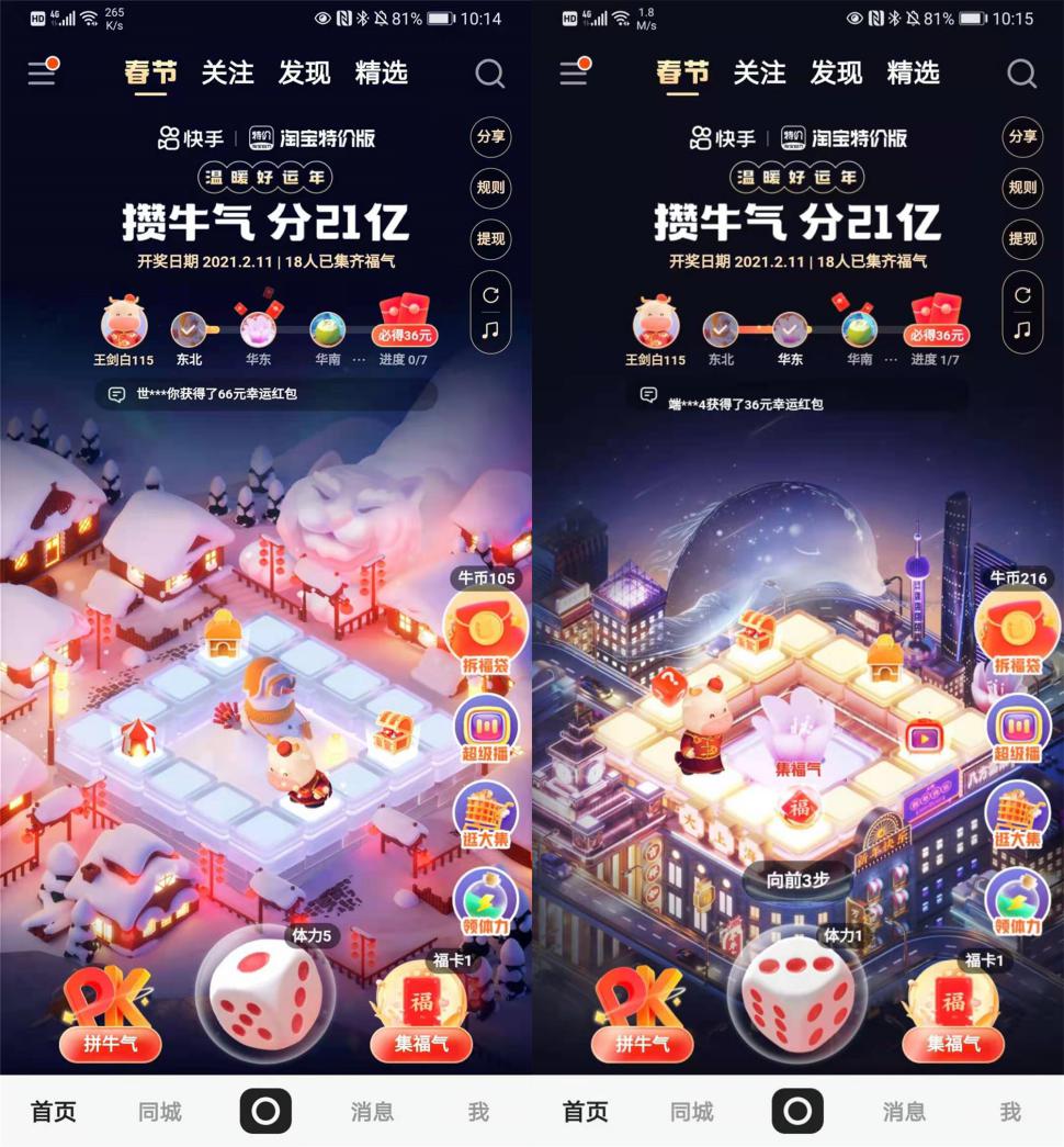 1月29日開始,用戶在快手APP點擊左上角“春節”按鈕,或者側邊欄的“攢牛氣分21億”可以進入“溫暖好運年”預熱場會場。進入會場后用戶要先從七種“福牛”的形象中選取自己的代言人,讓它成為用戶在游戲中的“旗子”,點擊骰子小牛在棋盤上行進,行進過程中可收獲多種福利。