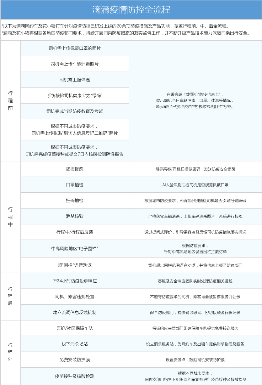 據了解,為嚴格落實防疫措施,提升司乘的防控意識,滴滴于2020年12月28日在北京全面升級防疫安全措施,司機需完成消殺等防疫措施,上傳相關資料方可提供服務。同時,滴滴出行及花小豬打車端內也上線了各類防疫安全提醒及問答,通過AI抽檢、行程中反饋等方式監督防疫措施的落實,北京地區口罩佩戴率提升至99.98%,健康寶掃碼率為98%。