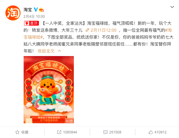 大年三十兒當天,淘寶上的重磅好戲更是一個接一個!中午12點,淘寶開年大錦鯉“福祿娃”將開獎!目前淘寶福祿娃的抽獎微博已經有超過100萬網友參與轉發,獎品清單也翻了一倍。官方透露,錦鯉的獎品已經陸續到達倉庫,蓄勢待發。如果你還沒有轉發的話,趕緊抓住最后的機會轉起來,畢竟這是一個“一人中獎親朋沾光”的年度大錦鯉。