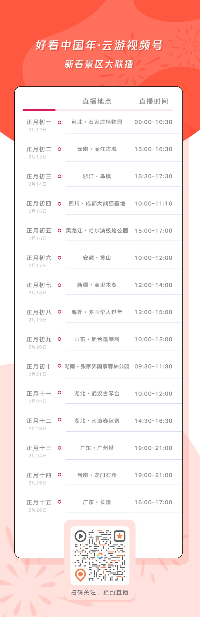 為幫助大家足不出戶游覽全國各地美景,感受各地年味兒,微信將聯合河北石家莊主流媒體、云南麗江古城、浙江烏鎮、黑龍江哈爾濱極地公園、四川成都大熊貓基地、山東煙臺蓬萊閣、河南龍門石窟等15個城市的知名景點聯合打造基于視頻號直播能力的“好看中國年·云游視頻號”新春大聯播。