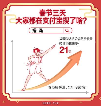 因返鄉和就地過年而分流的“打工人”們,也希望趁著假期休養身心、恢復元氣。春節三天,在支付寶平臺上,搓澡洗浴相關信息的搜索頻次,較1月同期提升了21%。其中,蘇州、杭州網友搜索的次數最多。