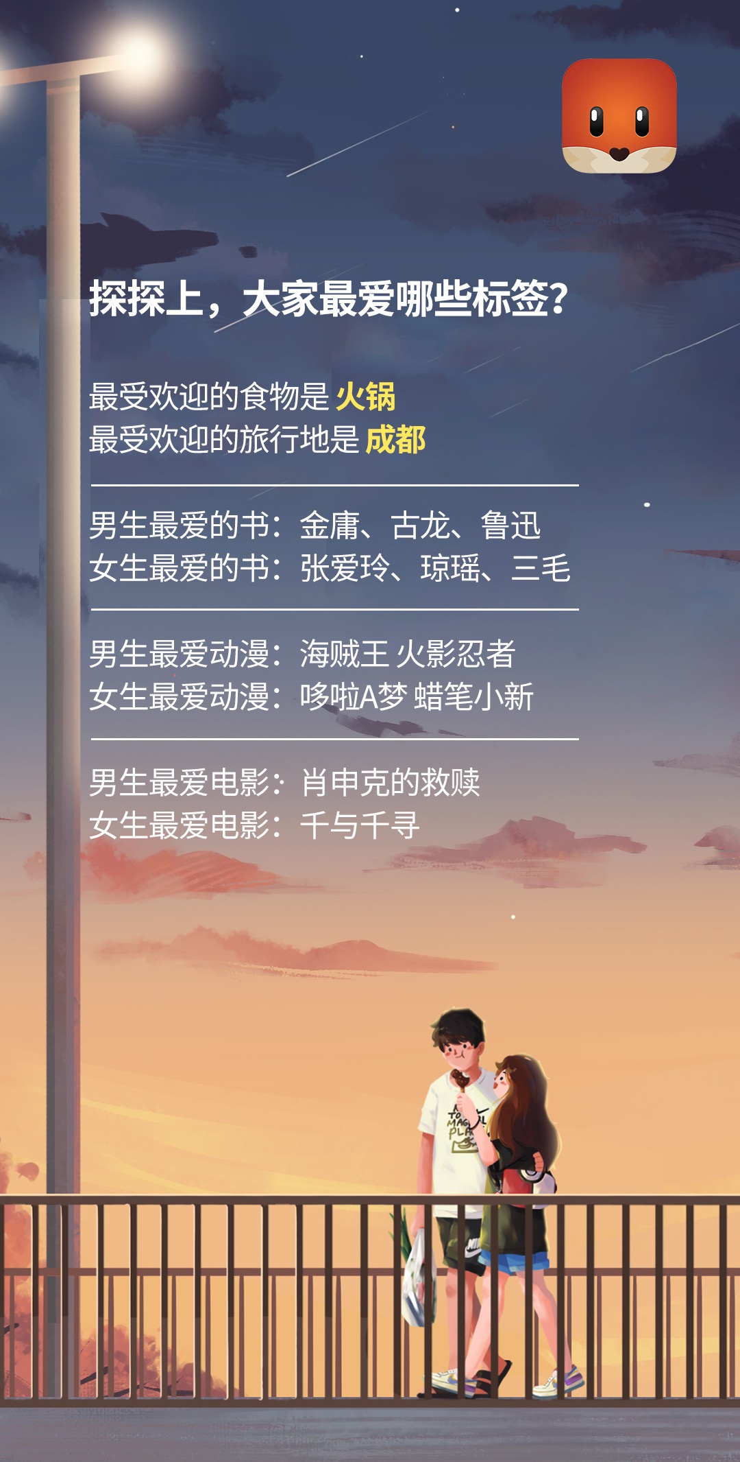 此外,男性用戶和女性用戶在興趣標簽上也呈現出鮮明的差異。探探個人資料的興趣標簽中,男性使用最多的書籍標簽TOP3是金庸、古龍和魯迅,使用最多的動漫標簽是海賊王和火影忍者;女性用戶使用最多的書籍標簽TOP3是張愛玲、瓊瑤、三毛,最愛的動漫標簽則是哆啦A夢、蠟筆小新。男生最愛的電影是《肖申克的救贖》,女生最愛的電影是《千與千尋》。