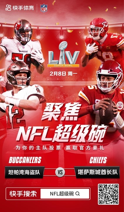 春節(jié)期間,快手體育聯(lián)手NFL中國,在第55屆超級碗活動前發(fā)起了“聚焦NFL超級碗-為你的主隊投票贏取官方豪禮“活動,活動中決賽兩支球隊“坦帕灣海盜隊”、“堪薩斯城酋長隊”分別入駐快手平臺,為球迷們帶來比賽前瞻、比賽集錦片段,給快手體育迷帶來最全面的超級碗短視頻內(nèi)容。