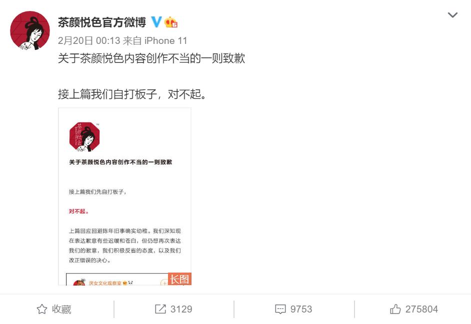 然而,不少網(wǎng)友并不買賬,并曬出茶包上的“官人我要”以及周邊產(chǎn)品包裝盒上的“皇家馬子”文案,要求官方給出一個解釋。2月20日凌晨,茶顏悅色再次發(fā)布致歉聲明,承認錯誤,并采取立即下架的處理方案。