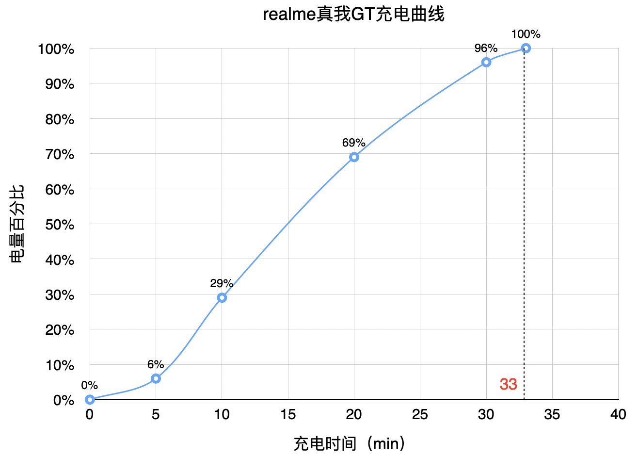 在充電測試環節,使用原裝充電器為手機進行充電,20分鐘即可為手機充電69%,0-100%充電僅需33分鐘。