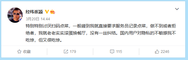值得一提的是,經緯中國創始管理合伙人張穎也在關注此事,并在其微博上公開炮轟“掃碼點單強制關注公眾號”存在侵犯隱私行為。