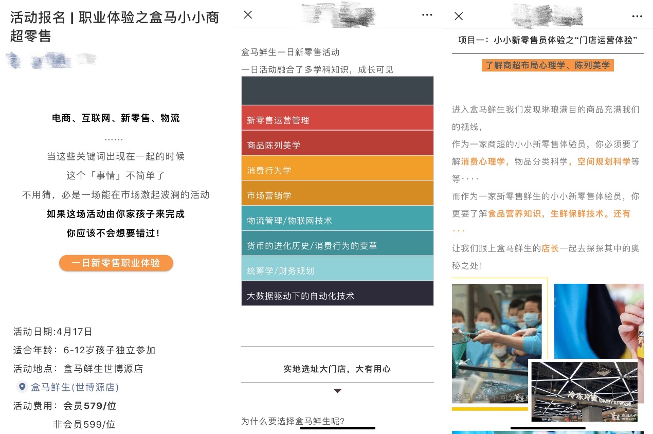 速途網(wǎng)4月9日消息(報(bào)道:李楠)日前,一則“新零售游學(xué)招募帖”在家長(zhǎng)群體中流傳。該活動(dòng)標(biāo)價(jià)599元一位,面向6-12歲的孩子,舉辦地點(diǎn)為盒馬鮮生門店,并有盒馬店長(zhǎng)帶隊(duì)探索學(xué)習(xí)。今天,盒馬通過官方微博辟謠稱,與這個(gè)活動(dòng)沒有合作,未來也不會(huì)開展此類高價(jià)活動(dòng)。