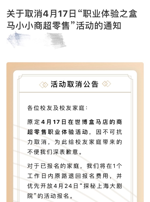 速途網(wǎng)查詢發(fā)現(xiàn),活動(dòng)招募于3月29日開啟。該公眾號(hào)隨后發(fā)布了一則活動(dòng)取消通知,表示“原定4月17日在世博盒馬店的商超零售職業(yè)體驗(yàn)活動(dòng),因不可抗力取消”。
