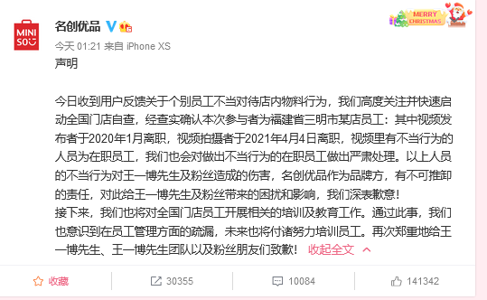 4月9日凌晨,名創優品在其官方微博就此事發布了道歉聲明,表示這是“個別員工不當對待店內物料行為”,官方對此“鄭重給王一博先生、王一博先生團隊以及粉絲朋友們道歉!”。另外,名創優品還解釋稱:會對惡意銷毀王一博物料的員工作出處罰,視頻發布者及拍攝者分別于2020年1月與4月4日離職。