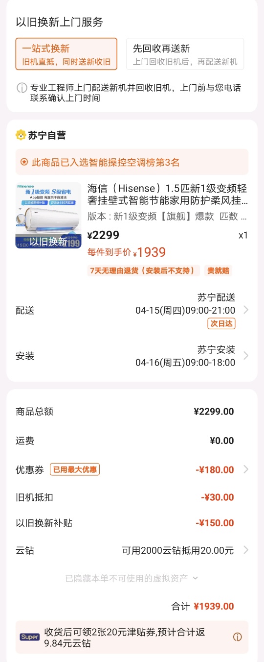 4月14日,蘇寧易購(gòu)最新版以舊換新正式上線。據(jù)頁(yè)面顯示,一鍵“立即換新”,即可進(jìn)行差價(jià)付款和一站式補(bǔ)貼直換。在新品訂單頁(yè)面,用戶也可以選擇一站式“同時(shí)拖舊送新”或先回收再送新。新機(jī)最快1小時(shí)即可到手。