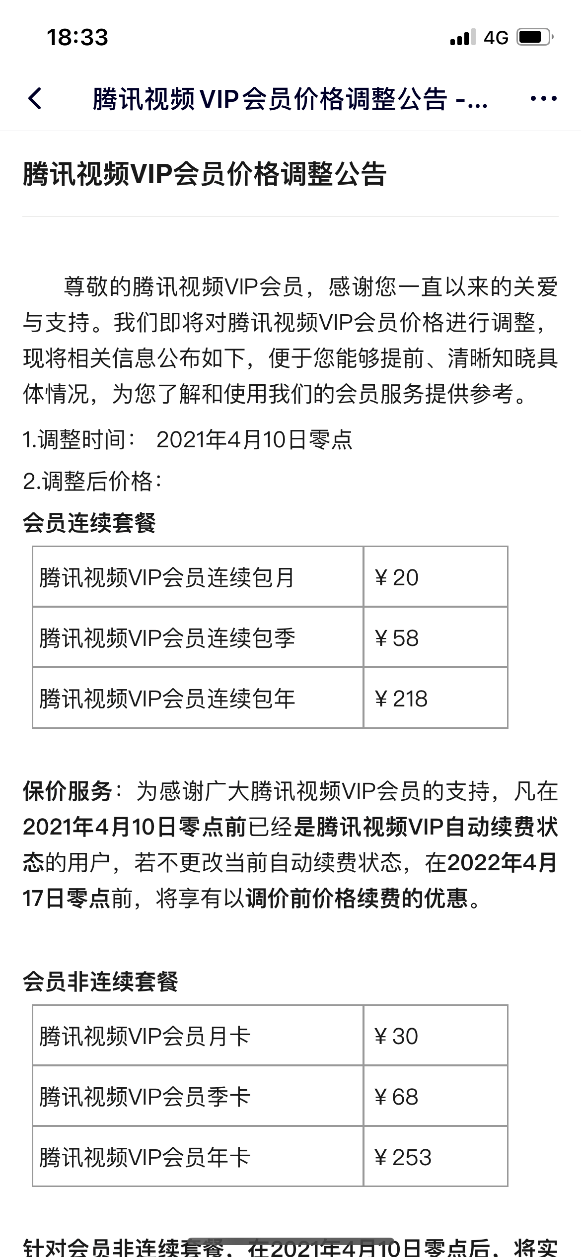 速途網(wǎng)4月15日訊(報道: 王璇)早在4月3日,騰訊視頻VIP就在官方微博上宣布會員提價,自4月10日零點起實行新的VIP價格,騰訊視頻新價格體系將調(diào)整為:連續(xù)包月、包季、包年的售價分別為20元、58元、218元,漲幅分別為33%、29%、42%;非連續(xù)會員月卡、季卡、年卡售價分別為30元、68元、253元,漲幅分別為50%、17%和28%。
