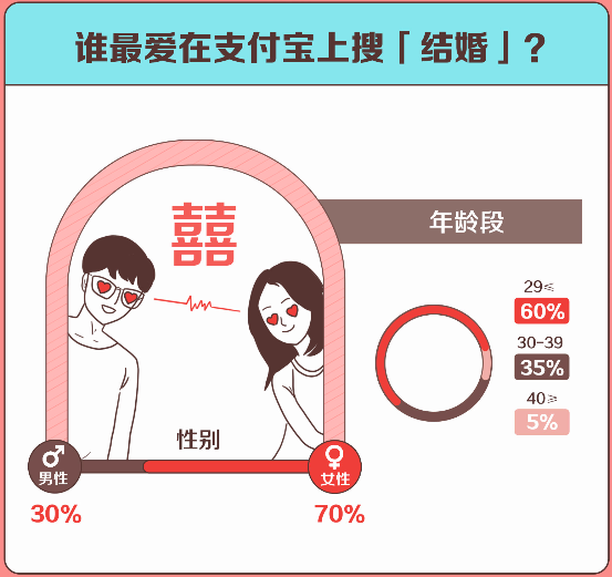 另有數據表明,上支付寶搜結婚相關服務的以90后為主,其中約七成為女性,不過40歲以上搜索人群中男性則占到了60%。