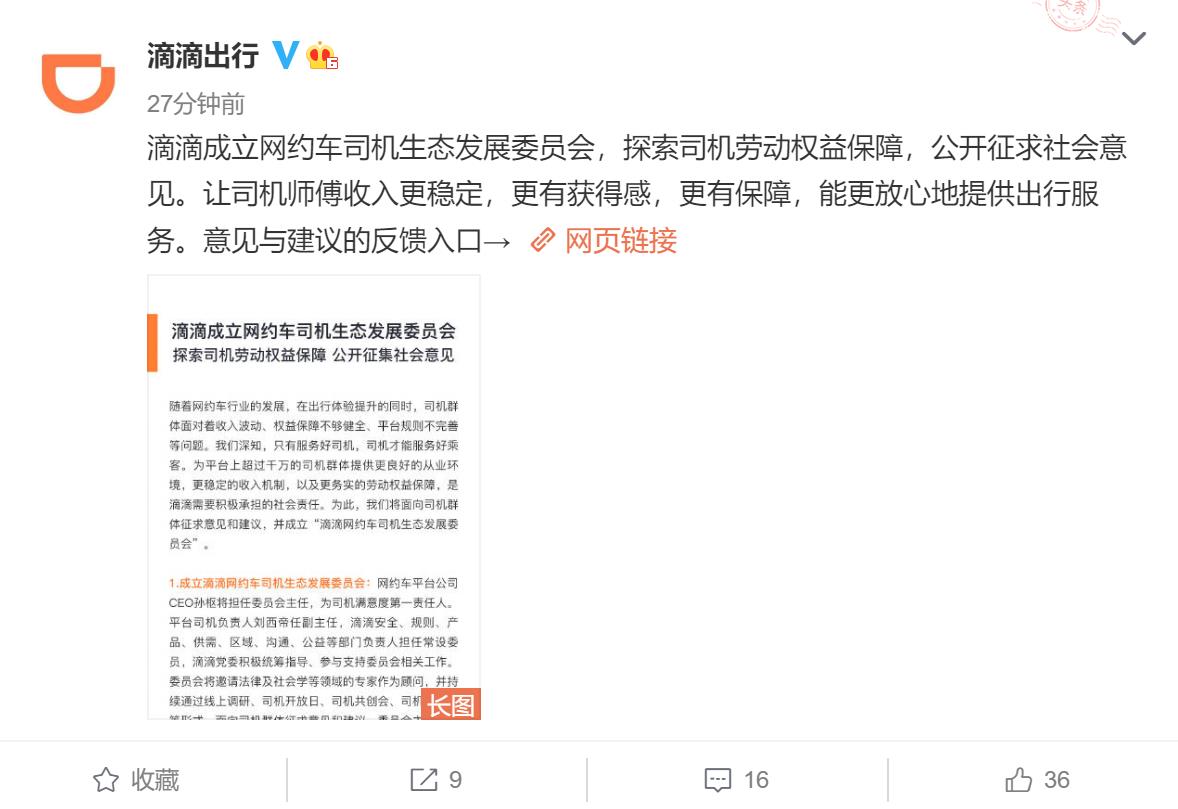 滴滴成立網(wǎng)約車司機(jī)生態(tài)發(fā)展委員會(huì) 探索司機(jī)勞動(dòng)權(quán)益保障 公開征集社會(huì)意見 隨著網(wǎng)約車行業(yè)的發(fā)展,在出行體驗(yàn)提升的同時(shí),司機(jī)群體面對(duì)著收入波動(dòng)、權(quán)益保障不夠健全、平臺(tái)規(guī)則不完善等問(wèn)題。我們深知,只有服務(wù)好司機(jī),司機(jī)才能服務(wù)好乘客。為平臺(tái)上超過(guò)千萬(wàn)的司機(jī)群體提供更良好的從業(yè)環(huán)境,更穩(wěn)定的收入機(jī)制,以及更務(wù)實(shí)的勞動(dòng)權(quán)益保障,是滴滴需要積極承擔(dān)的社會(huì)責(zé)任。為此,我們將面向司機(jī)群體征求意見和建議,并成立“滴滴網(wǎng)約車司機(jī)生態(tài)發(fā)展委員會(huì)”。