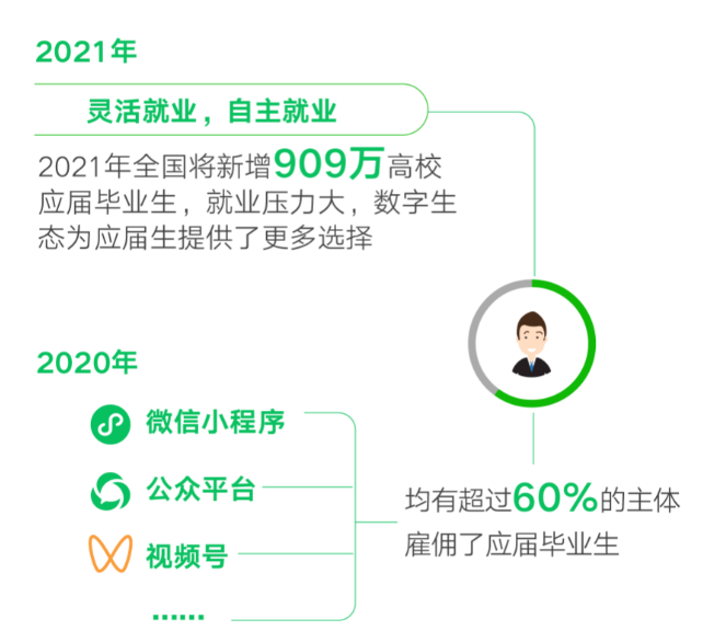 新工種不斷涌現——自2019年以來,人社部已經發布了4批共56個新職業,今年3月,人社部會又聯同國家市場監管總局、國家統計局發布了18個新職業信息,數字新生態崗位爆發態勢顯著。據報告,2020年微信生態衍生的就業機會達到3684萬個,同比增長24.4%。其中微信小程序等數字化工具在疫情中發揮了重要的促銷費、穩就業作用,小程序開發、產品、運營等工作機會超過780萬個,同比增長45.6%。2020年初新上線的微信視頻號也在視頻拍攝、直播帶貨等方面產生了超百萬個就業機會。
